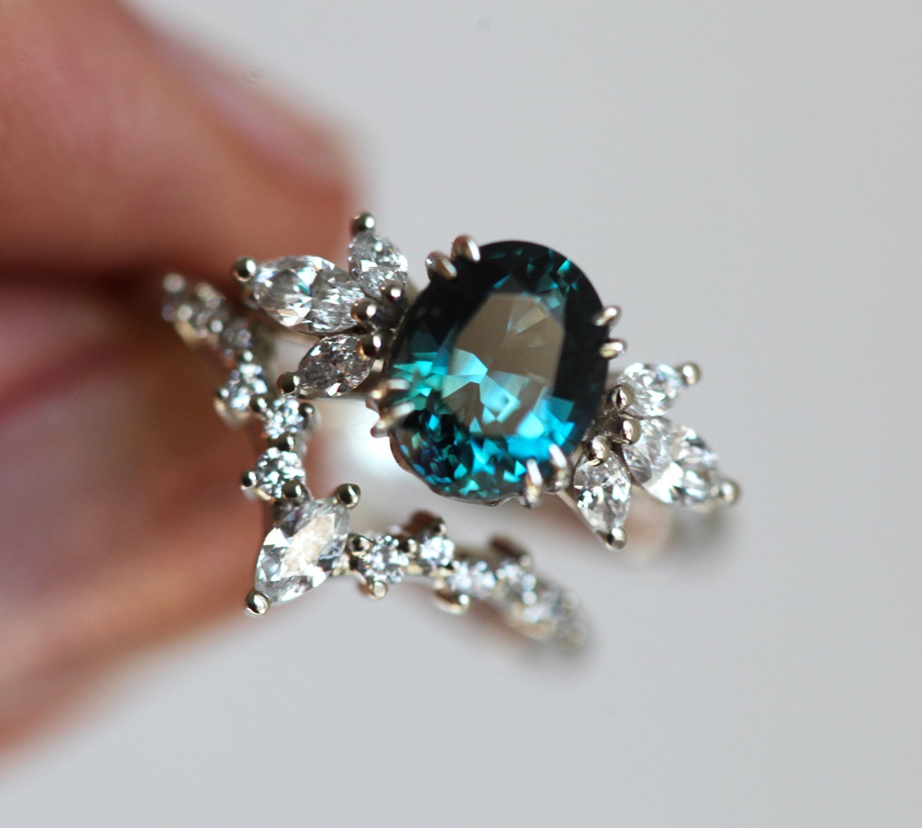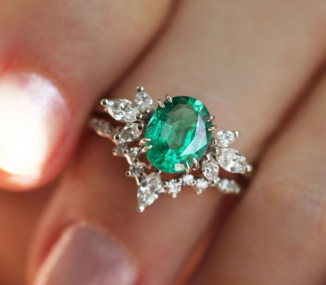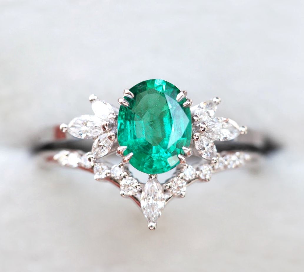 Elegantna i odvažna, naš Vera prsten je savršen verenički prsten. Prikazuje ovalno sečen smaragd naglašen belim dijamantima sa strane, a dodatak marquise prstena čini ga jednostavno idealnim.