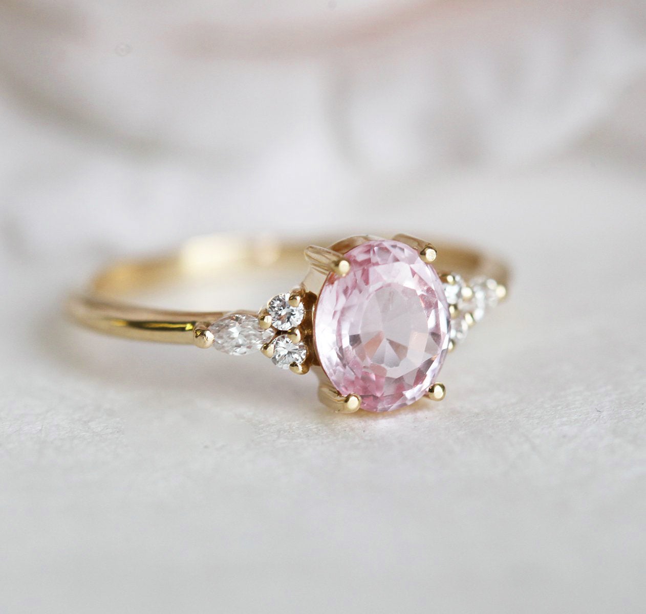 Elegantni i romantični prsten sa ovalnim breskvastim safirom i bočnim dijamantima za savršenu harmoniju.