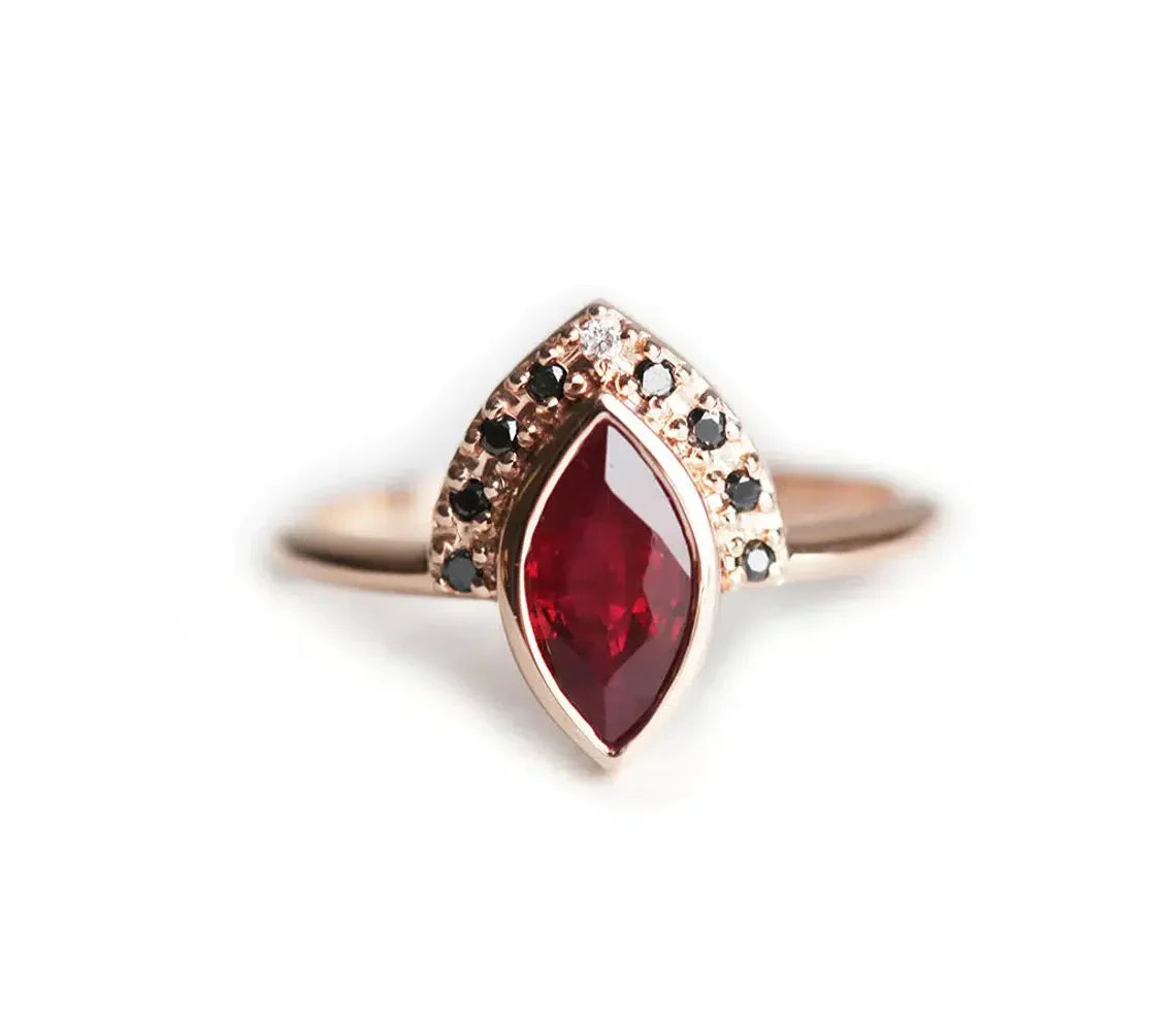 Regina - samo ime koje budi osećaj kraljevskog. Ovaj prelepi marquise rubin set prstenova sastoji se od dva izvanredna dela. Verenički prsten sadrži crveni rubin sa krunom od četiri okrugla crna dijamanta sa svake strane i jednim okruglim belim dijamantom na vrhu. Prateći prsten ima chevron sa jednim okruglim belim dijamantom na vrhu, koji se uklapa sa vereničkim prstenom. Dok vi i vaša voljena osoba stupate u brak, ovaj izvanredni set prstenova sa rubinom i belim i crnim dijamantima doneće novo značenje pojmu kraljevskog.