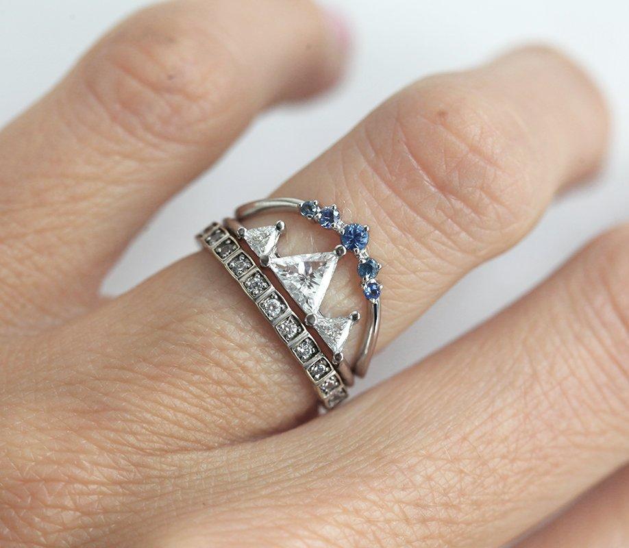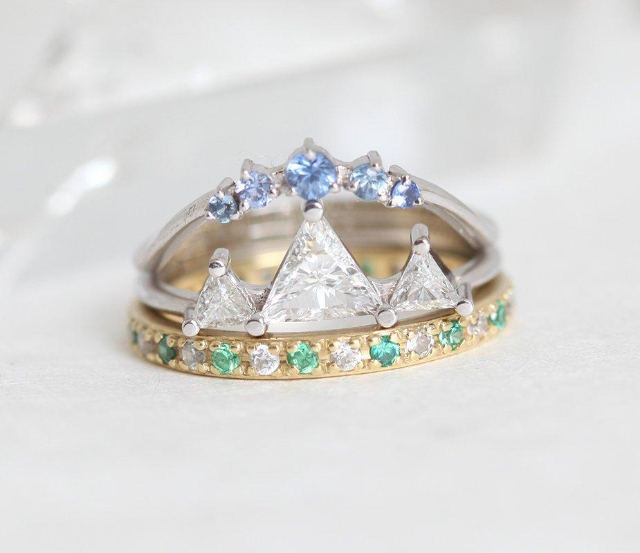 Ovaj izuzetni set prstenova izgleda kao da je izašao iz zimske bajke. Glavni prsten sadrži tri triangle-cut dijamanta koji podsećaju na najviši vrh Julijskih Alpa, Triglav. Da simbolizuje padanje snega, uklapajući prsten sa safirima pada preko dijamanata.