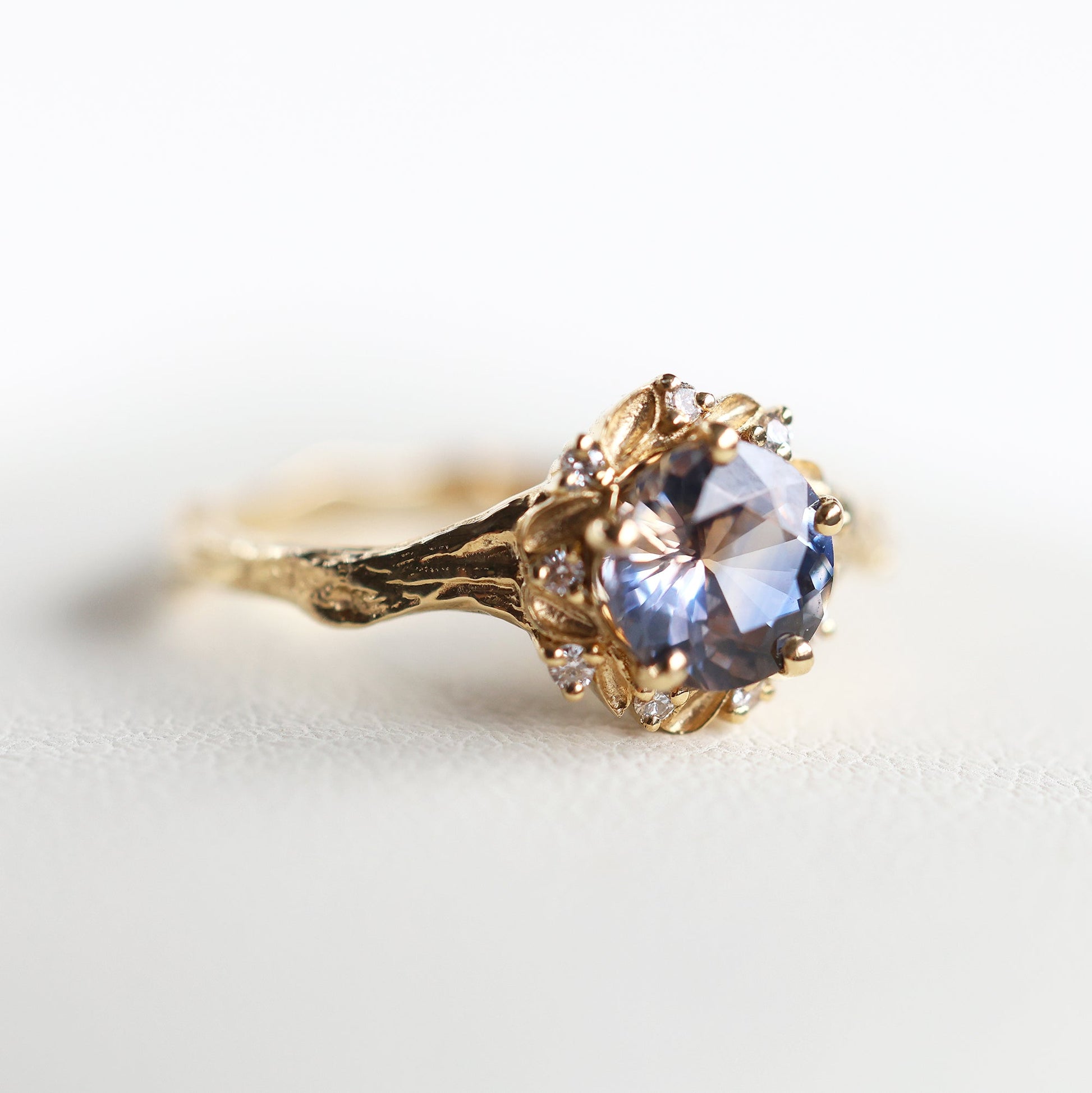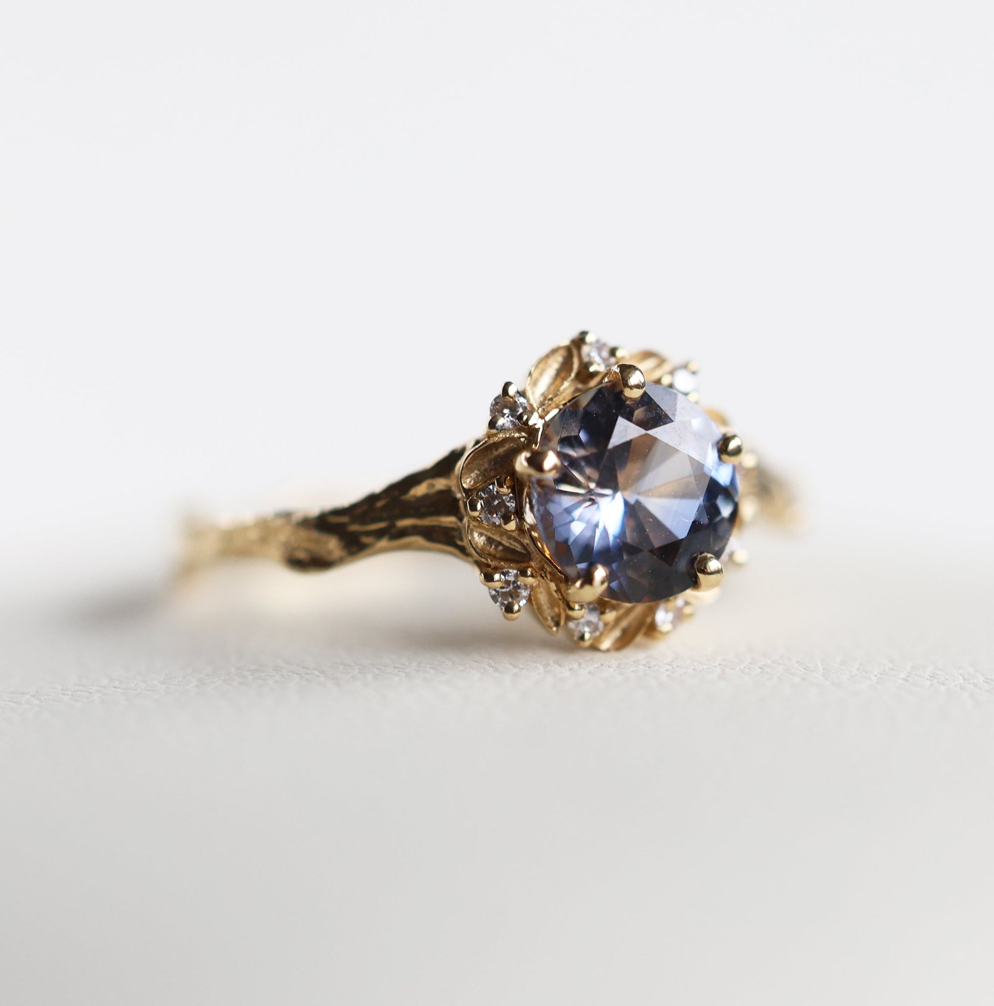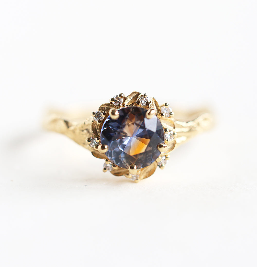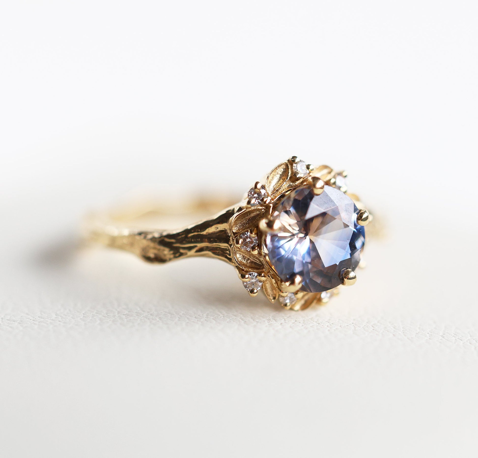 Jedinstveni verenički prsten sa prirodnim dvobojnim safirom i bočnim dijamantima u obliku listova. Dostupan i sa drugim dragim kamenjem.