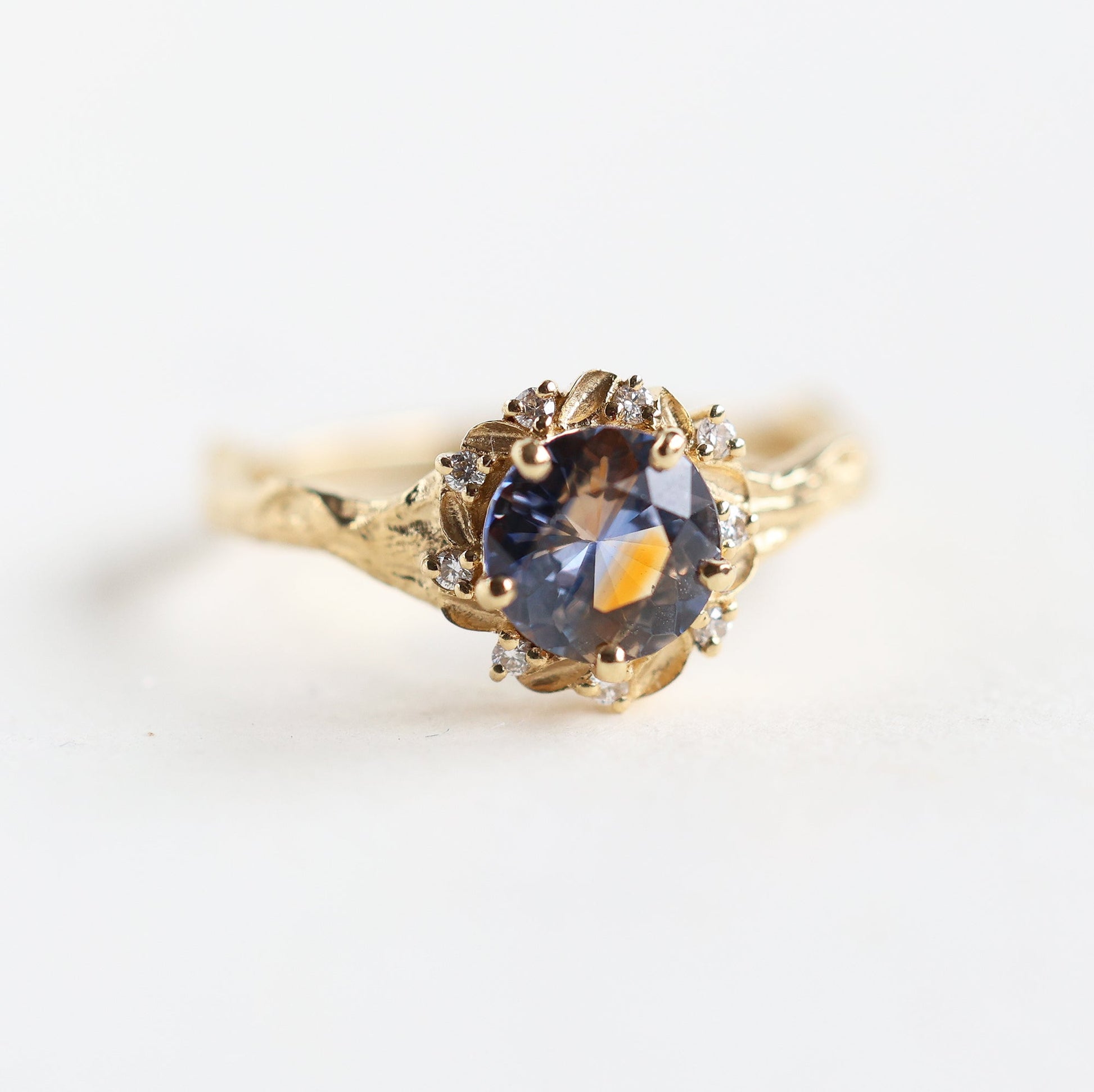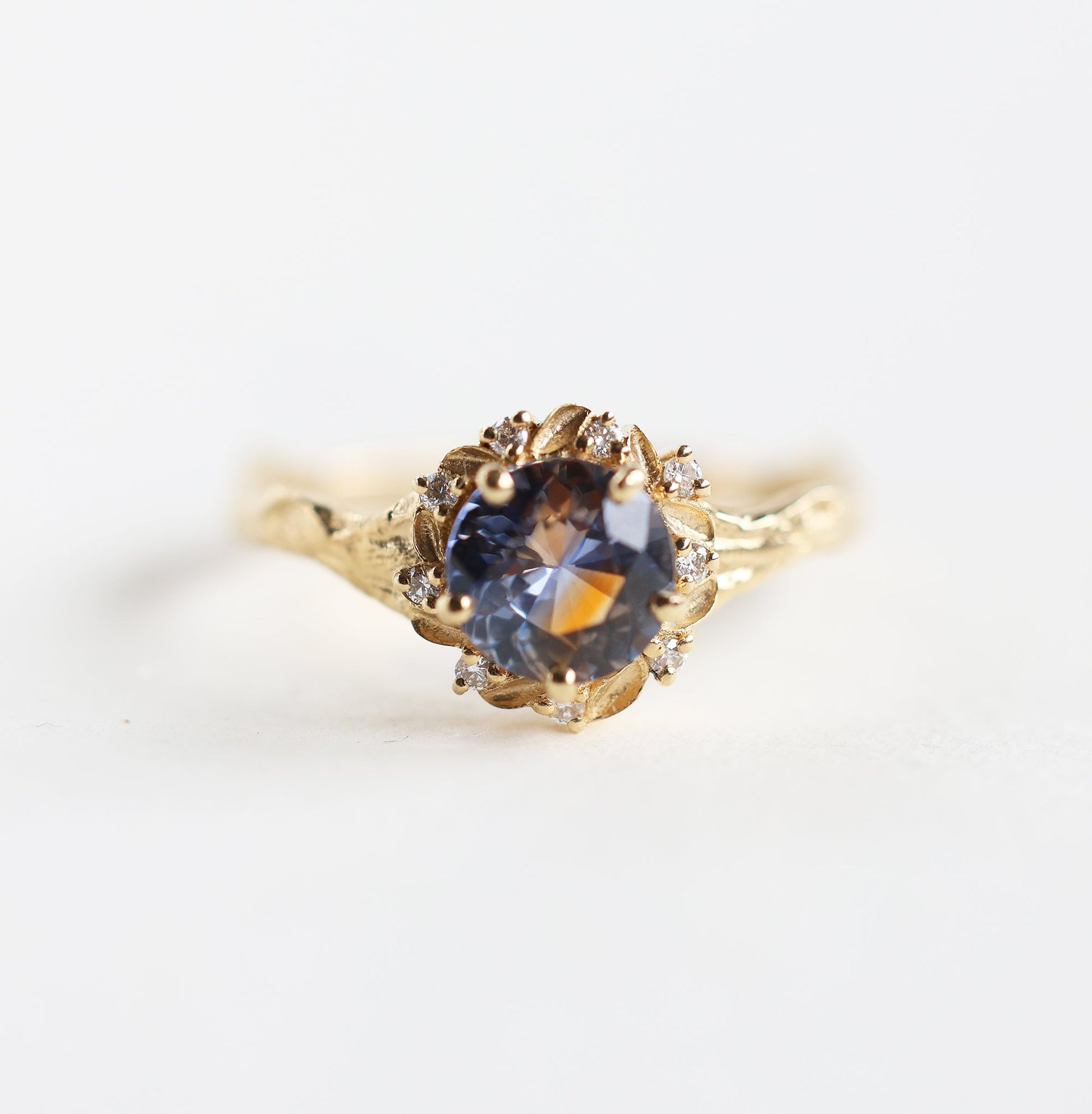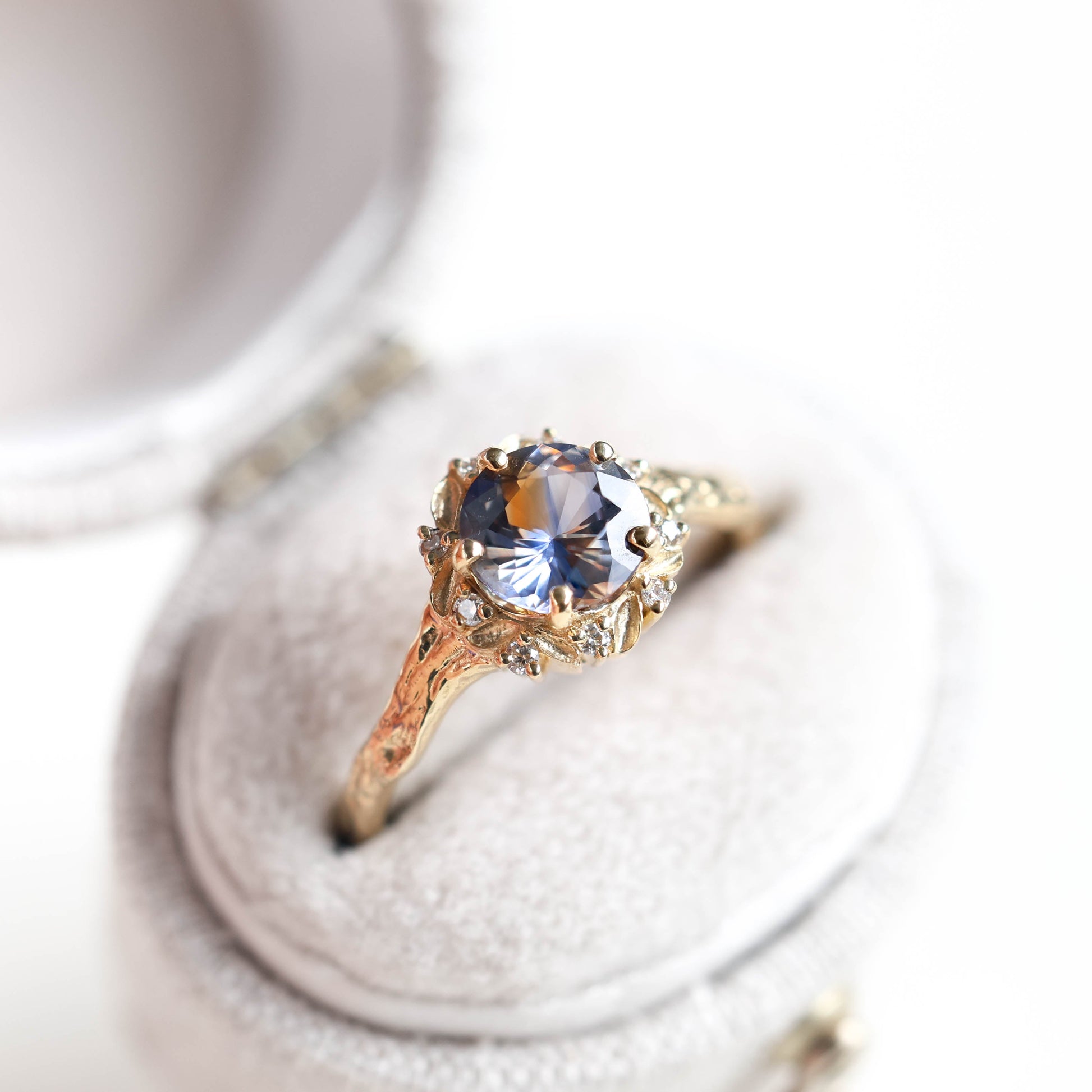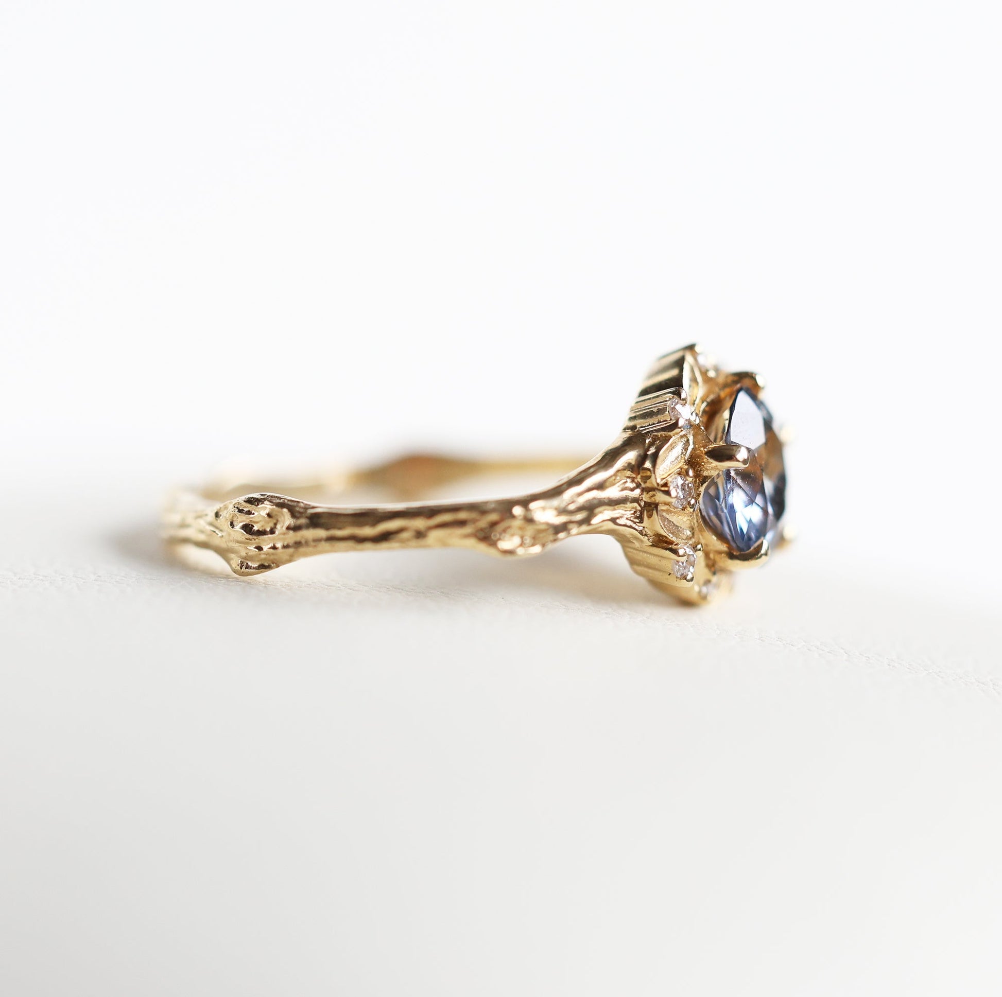 Jedinstveni verenički prsten sa prirodnim dvobojnim safirom i bočnim dijamantima u obliku listova. Dostupan i sa drugim dragim kamenjem.