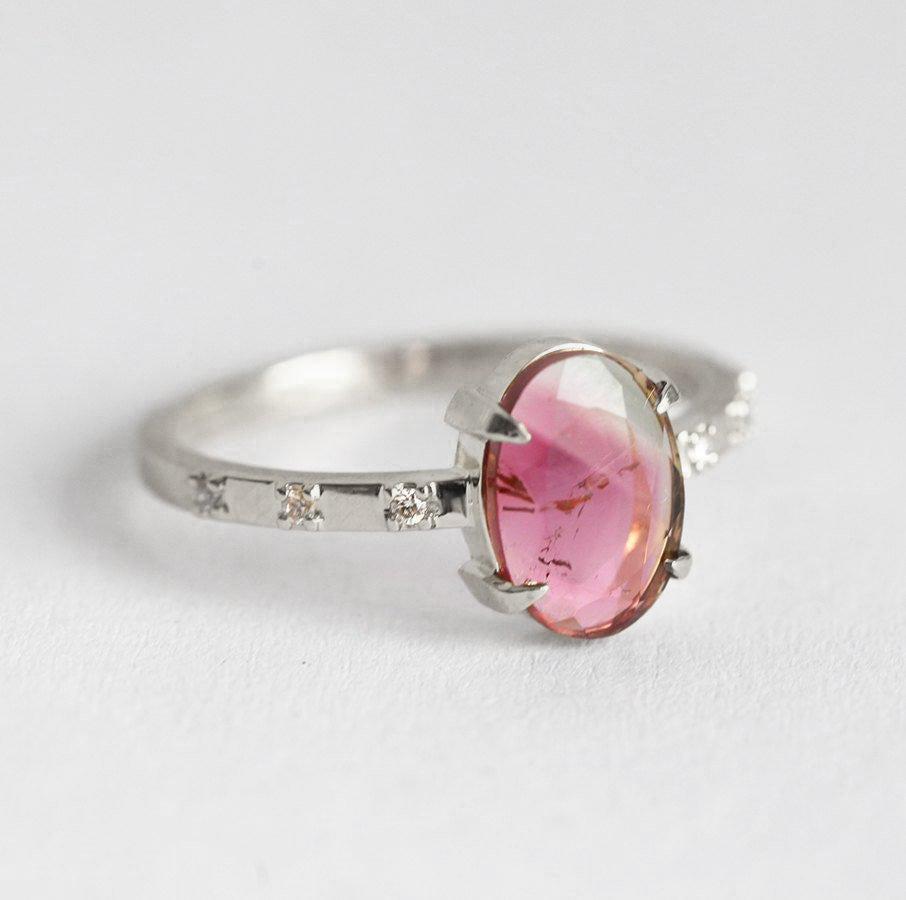 Verenički prsten sa turmalinom boje lubenice i bočnim dijamantima