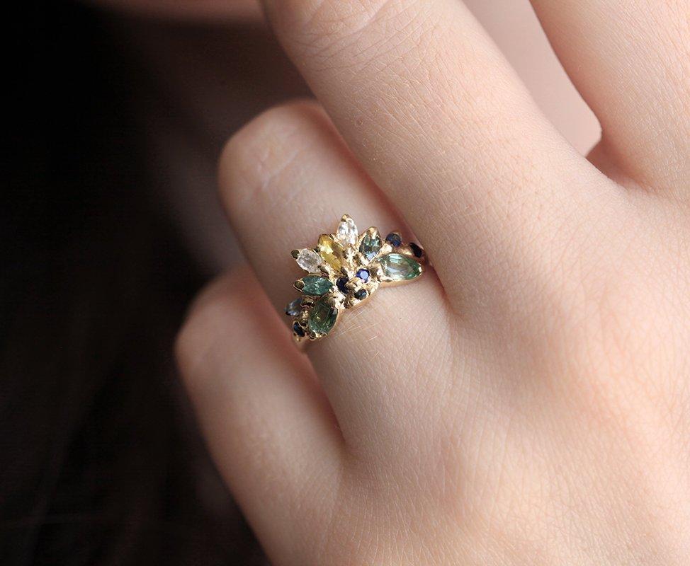 Luksuzni prsten od žutog zlata sa raskošnim safirima u različitim bojama – primer vrhunskog zanatstva i jedinstvenog dizajna koji će vaš poseban dan učiniti nezaboravnim.